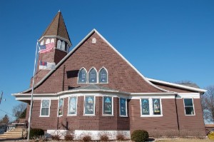 Religious services were held in a large barn built by Joseph Dunlap on his farm north of Edgington. It was here that the Gospel was preached monthly during the summer season through the late fall of 1845 when the church in Edgington was built on three acres of ground donated by Daniel Edgington. The building was a plain front structure of 22 x 40 feet. The vestibule, gallery, and tower were added in 1869.
