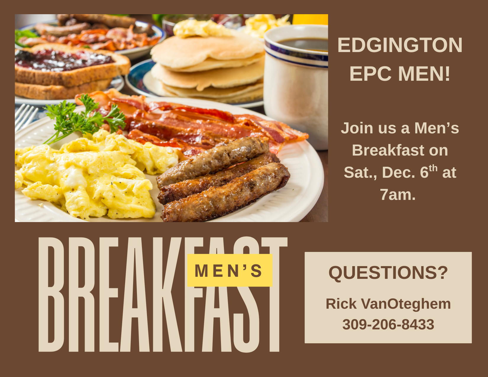 Get together with all your brothers in Christ for a hearty breakfast this Sunday. We will be wrapping up our discipleship groups for 2025 and looking ahead to 2026.